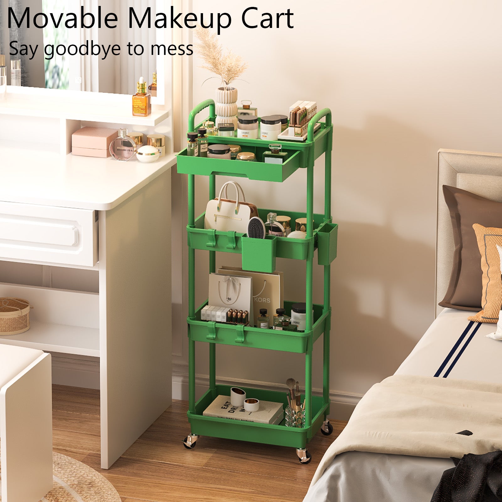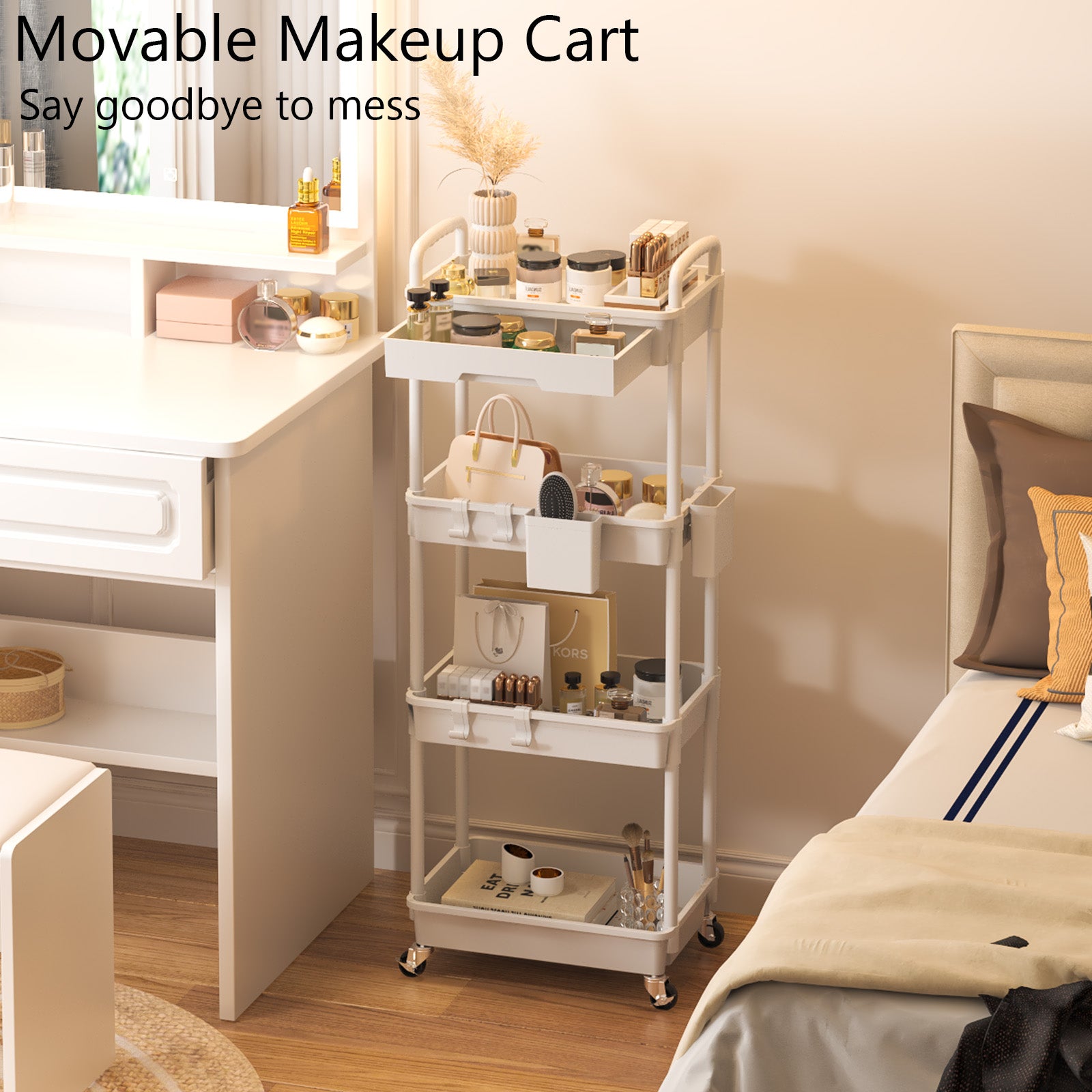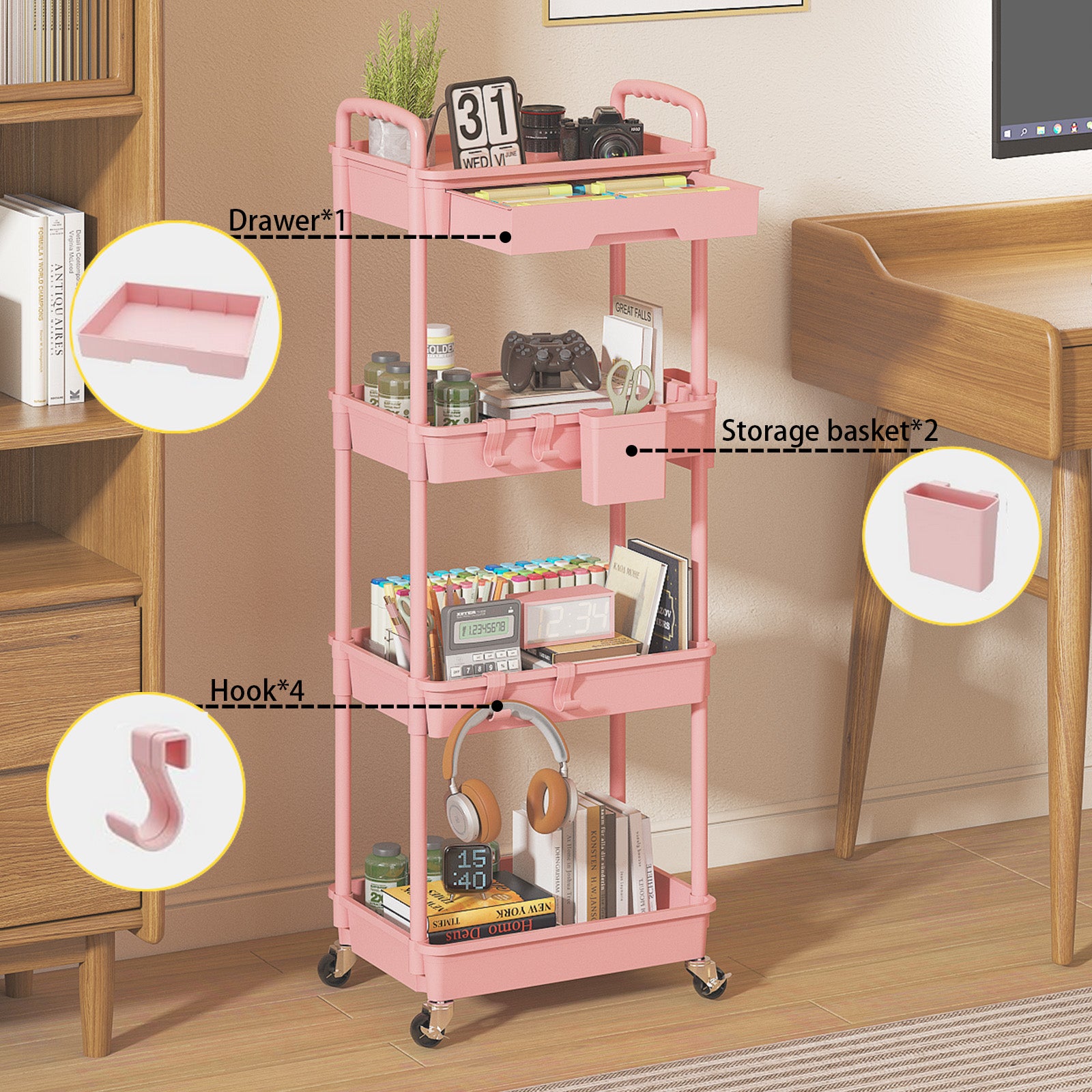 4 Tier Rolling Cart with Drawer, Utility cart with Handle, Bathroom Cart, Snack Cart, Storage Organizer with Lockable Wheels, Rolling Storage Cart for Kitchen, Bathroom, Office, 4 Tier
