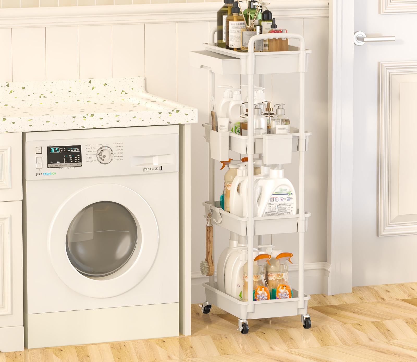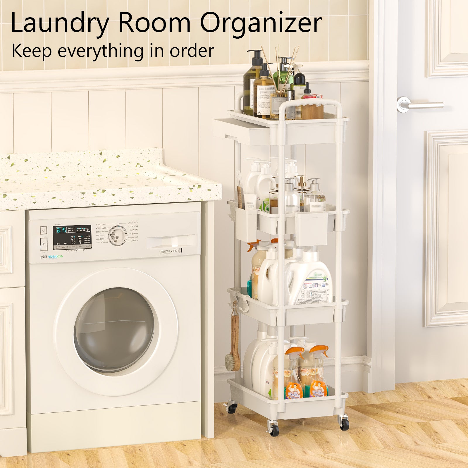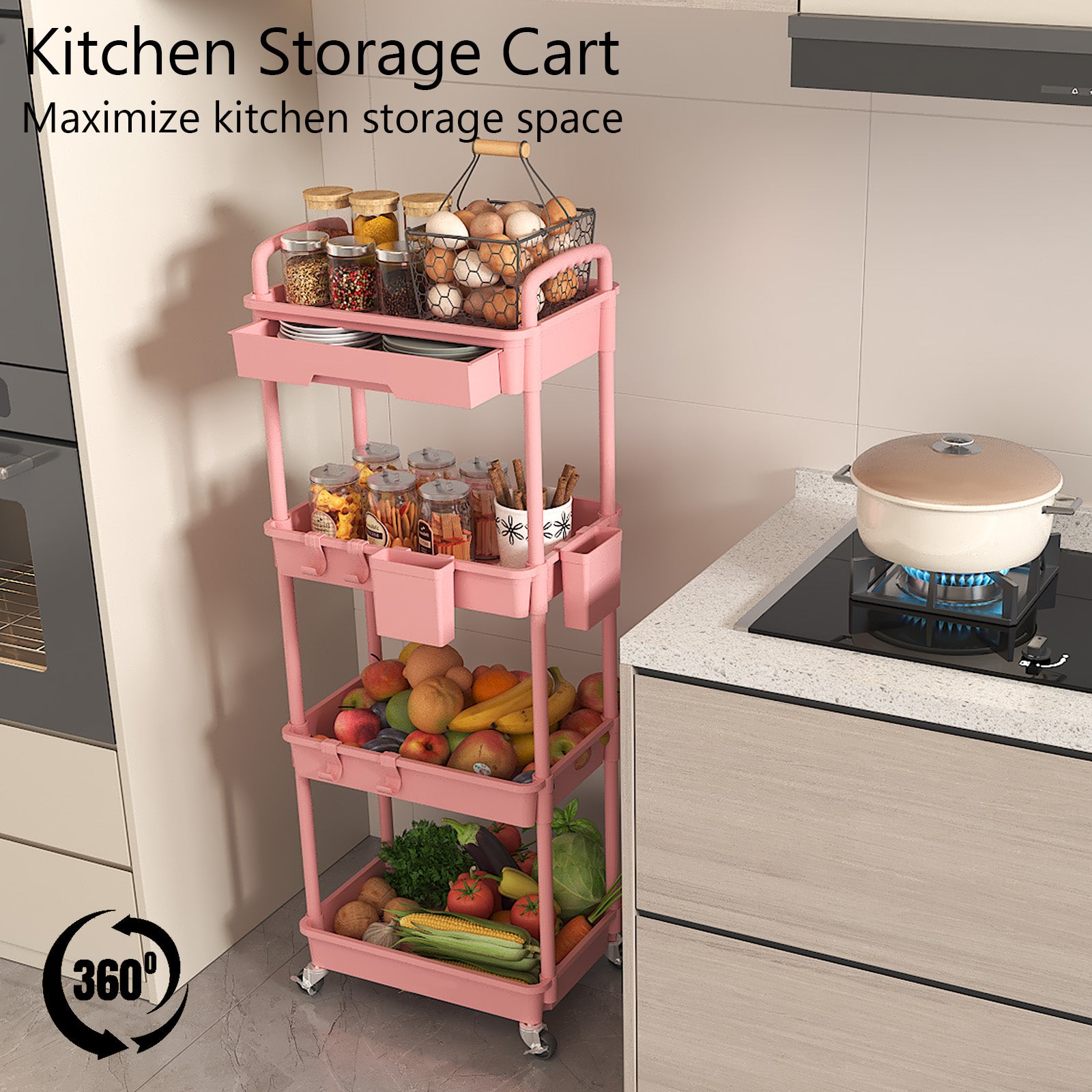 4 Tier Rolling Cart with Drawer, Utility cart with Handle, Bathroom Cart, Snack Cart, Storage Organizer with Lockable Wheels, Rolling Storage Cart for Kitchen, Bathroom, Office, 4 Tier